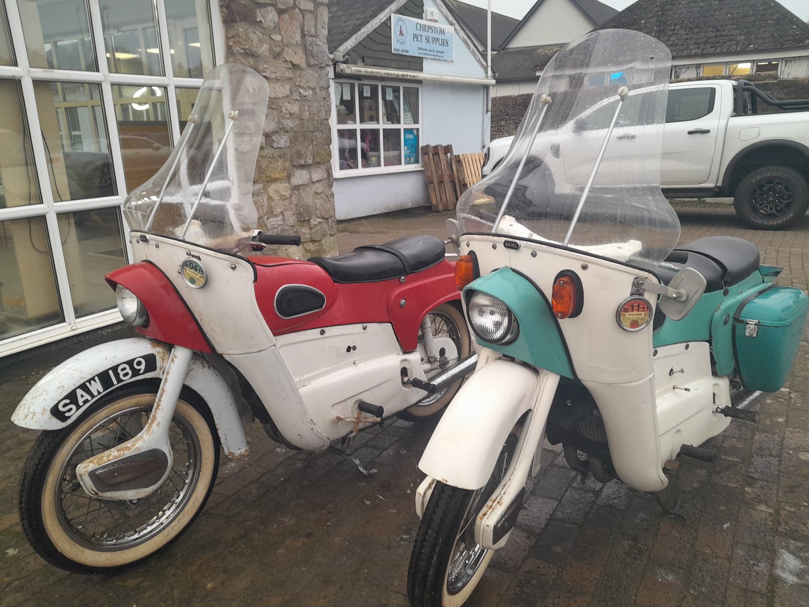 The red one has 47K miles and seems to have a seized engine, but is otherwise in fair condition. The blue one has just 3,500 miles on the clock and has the luggage pack of panniers and top box bed. Both have some rust on the bodywork and the chrome on exhausts and wheel rims is in need of refurbishment, the red one somewhat more so than the blue one. The only way to evaluate the true potential of these lovely bikes is to call in at our Chepstow showroom and take a look. We are here Tuesday to Sunday 10am to 6pm. If you are too far away, keep an eye on this page for more pictures and information, when my camera comes back from repair…Get More Information or copy the link to this article.