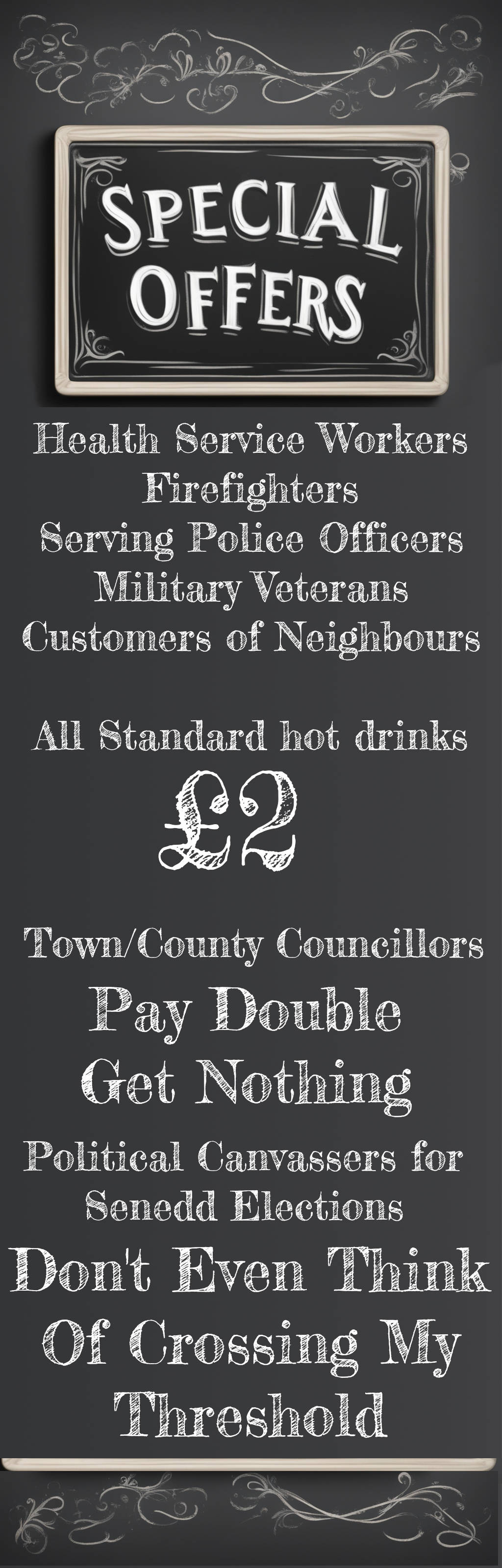 By way of saying "Thank You" to the people that we value in society because they take care of us, anyone in the health service, the fire or police services, services veterans and customers of our neighbouring small businesses get a discount on any of our delicious coffees, tea or tisanes.